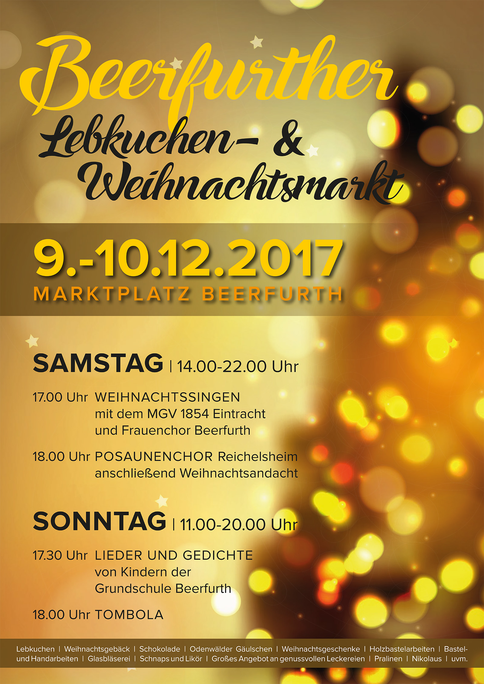 An jedem zweitem Adventswochenende herrscht weihnachtliche Stimmung auf dem festlich beleuchteten Beerfurther Marktplatz. Hier präsentierten Beerfurther Traditionsbetriebe ihre Produkte, bieten Lebkuchen, Plätzchen, Schokoladennikoläuse, Odenwälder Gäulschen, Schnaps und Liköre an. Beerfurther Vereine bieten den Gästen ihre Leckereien an, es gibt handgemachtes der Landfrauen, schöne Holzbastelarbeiten und hübsche weihnachtliche Dekoration. Kreativ sind auch die Kinder und Eltern der Grundschule, nicht nur mit einem eignen Stand, es werden auch Geschichten von Kindern für Kinder vorgelesen und am Sonntagabend versammelten sich alle Kinder auf dem Marktplatz um Weihnachtslieder zu singen und Gedichte vorzutragen. Bei einem Ballonflugwettbewerb gibt es für Kinder etwas zu gewinnen. Ein charmanter Weihnachtsmarkt, der Sonntagabend mit einer großen Tombola zu Ende geht.